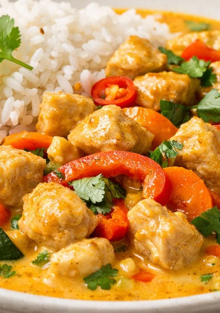 Na oleji osmahněte cibuli, přidejte 1–2 lžičky kari thajský typ a krátce opečte (30 sekund). Zalijte 400 ml kokosového mléka, přidejte maso nebo zeleninu a vařte 15–20 minut. Dochuťte limetkovou šťávou a podávejte s rýží.