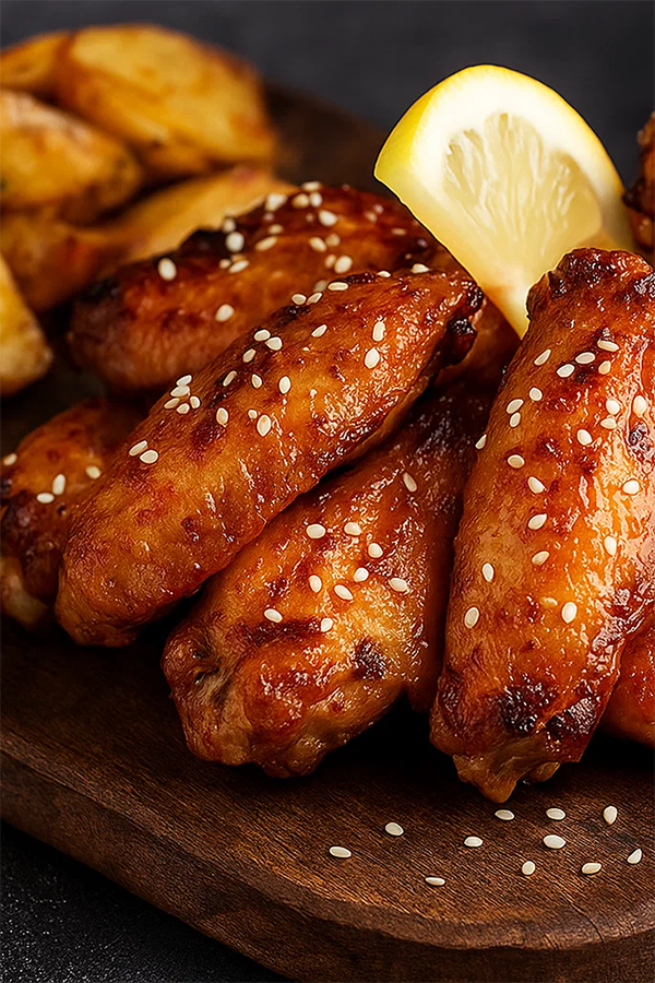 Postup: 1) V míse smíchejte olej, citron, med, česnek a směs 25 chutí. 2) Přidejte křidélka, dobře promíchejte a marinujte 1–3 hodiny v lednici. 3) Pečte na 200 °C 30–35 minut (na grilu střední žár 20–25 minut), v polovině obraťte a potřete zbytkem marinády. 4) Podávejte s pečenými bramborami nebo salátem; na závěr můžete zlehka posypat sezamem.
