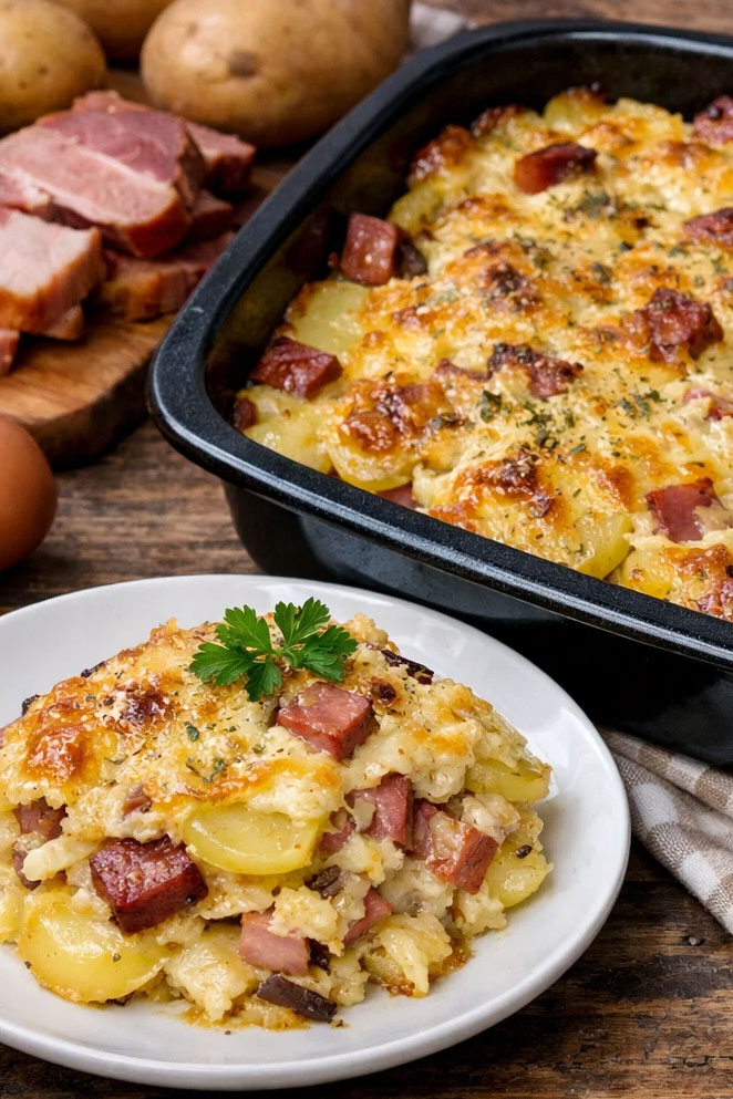 1 kg brambor oloupejte a nakrájejte na tenké plátky. Uzené maso nebo klobásu nakrájejte na kostičky, cibuli najemno. Vejce (3 ks) rozšlehejte s 200 ml smetany, přidejte sůl a 1–2 lžičky koření Francouzské brambory. Vymažte pekáč olejem a vrstvěte brambory, maso a cibuli – každou vrstvu posypte kořením. Nakonec zalijte vaječnou směsí. Pečte v předehřáté troubě na 180 °C přibližně 45 minut, dokud nejsou brambory měkké a povrch zlatavý.